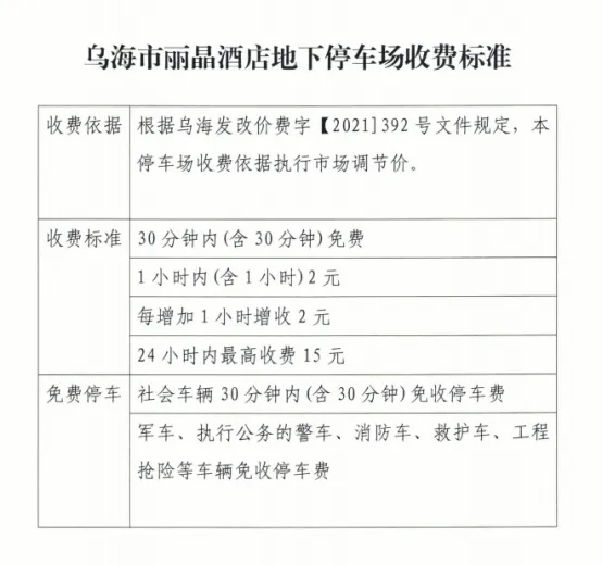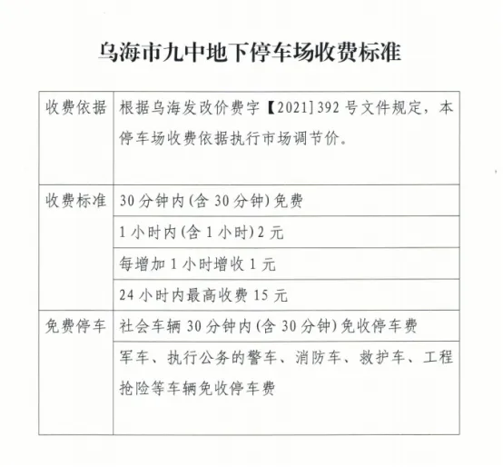 為緩解地面停車壓力,引導車輛有序停放,烏海市濱河九中地下停車場與麗晶國際酒店地下停車場已完成智能化升級改造。2024年7月25日經海勃灣區(qū)城市管理綜合執(zhí)法局批準,兩個停車場于近期正式開展停車收費管理,收費標準見下表: